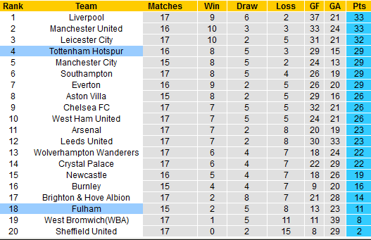 Nếu như Tottenham vẫn được coi là đối thủ tiềm tàng cho cuộc đua vô địch. Kane cùng các đồng đội chỉ ít hơn vị trí dẫn đầu 4 điểm nhưng đá kém 1 trận. Trong khi đó, Fulham sớm lộ rõ nhiều điểm yếu của một tân binh với vị trí thứ 3 từ dưới lên hiện nay.