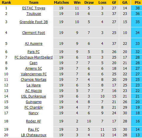 Troyes đã chính thức vô địch lượt đi Ligue 2 và tất nhiên đang nắm thế chủ động trong cuộc đua trở lại Ligue 1 vào cuối mùa. Lúc này, đội chủ nhà đang hơn vị trí thứ 3 đúng 3 điểm nên mọi chuyện vẫn còn ở phía trước.