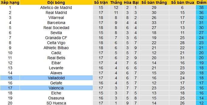 Sau 17 vòng đấu tại giải vô địch quốc gia Tây Ban Nha La Liga, Valladolid mới có được 18 điểm và đang tạm đứng thứ 15 trên bảng xếp hạng. Hiện Valladolid đang có cùng bằng điểm với 2 đội xếp ngay trên và cũng chỉ hơn các đội trong nhóm cầm đèn đỏ 2 điểm.