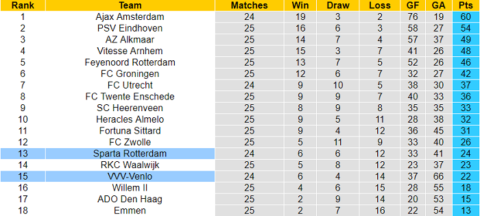 VVV Venlo cũng bất bại 3/4 trận sân nhà gần đây thuộc khuôn khổ giải VĐQG Hà Lan và giành 7/12 điểm tối đa. Sau những gì đã thể hiện trên sân nhà, VVV Venlo đủ khả năng giành điểm khi tiếp đón Sparta Rotterdam.