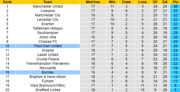 Trên bảng xếp hạng Premier League 2020/21, West Ham đang xếp thứ 10 với 26 điểm. Trong khi đó Burnley mới giành được 16 điểm, xếp ở vị trí thứ 16. Trong vòng 8 trận đã đấu trên sân khách tại Ngoại hạng Anh mùa này, Burnley để mất điểm tới 7 lần với 4 thất bại và 3 trận hòa.