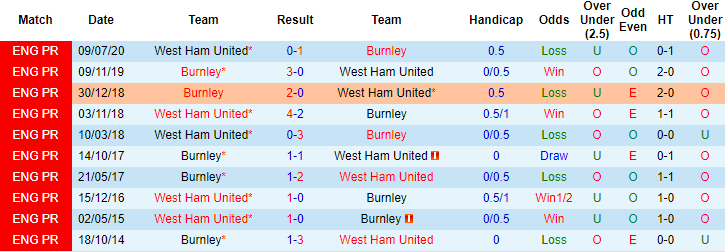 Burnley là một trong những đối thủ mà West Ham không muốn gặp tại giải Ngoại hạng Anh. 3 lần chạm trán Burnley gần đây, đội bóng có biệt danh Búa tạ toàn thua, thủng lưới 6 lần mà không ghi nổi 1 bàn danh dự. Xa hơn, 6 lần chạm trán Bunley trước đó, West Ham mất điểm 5 lần với 1 trận hòa và 4 thất bại.