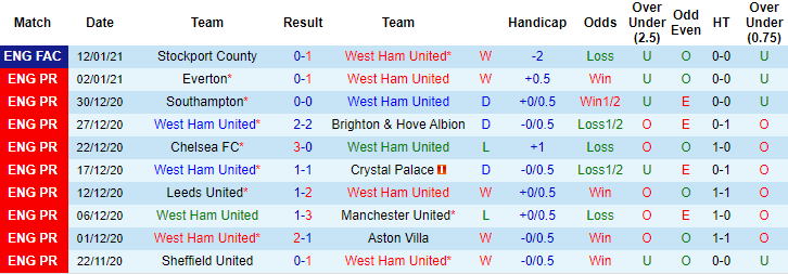 + Thống kê 10 trận gần nhất của West Ham
