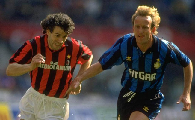 Andreas Brehme (phải) trong trận derby thành Milano thời còn thi đấu
