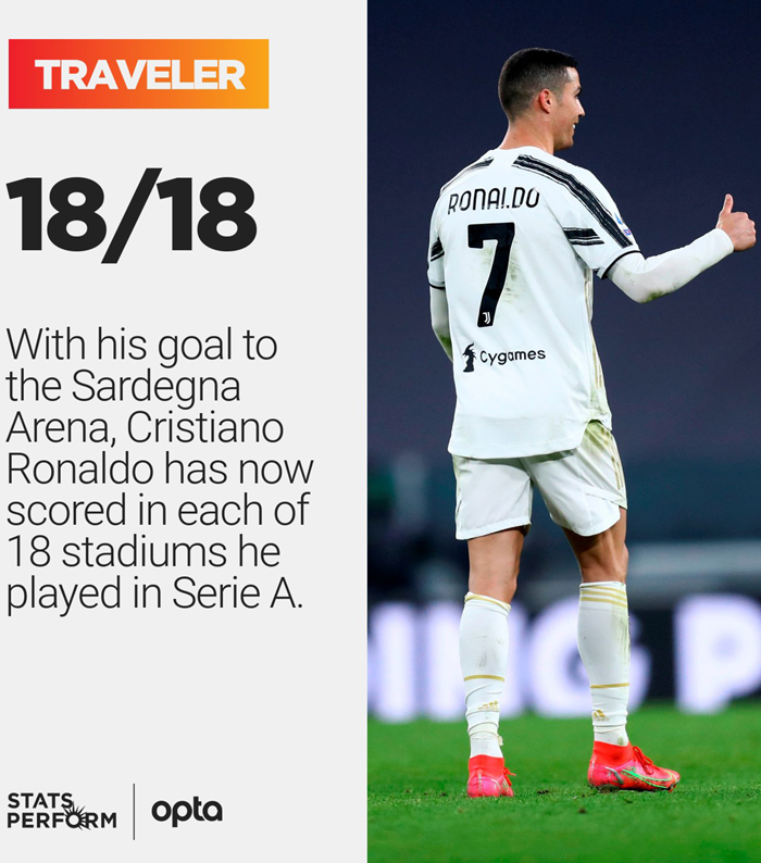 Cũng với cú hat-trick trước Cagliari, Ronaldo đã ghi bàn trong cả 18 sân vận động anh từng thi đấu tại Serie A. Đây là điều mà không phải cầu thủ nào cũng làm được.