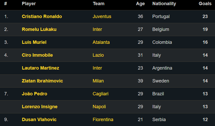 Trên bảng xếp hạng Vua phá lưới Serie A 2020/21, Ronaldo củng cỗ vững chắc vị trí số 1 với 23 pha lập công. Dẫu vậy, đến thời điểm hiện tại CR7 vẫn chưa chắc chắn trở thành cầu thủ xé lưới đối phương nhiều nhất giải đấu số 1 Italia mùa này.