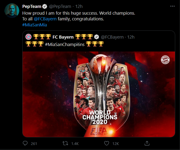 “Xin gửi lời chúc mừng tới toàn thể đại gia đình Bayern Munich vì kỳ tích này! Họ đã trở thành nhà vô địch FIFA Club World Cup và đặc biệt: giành 6 danh hiệu.