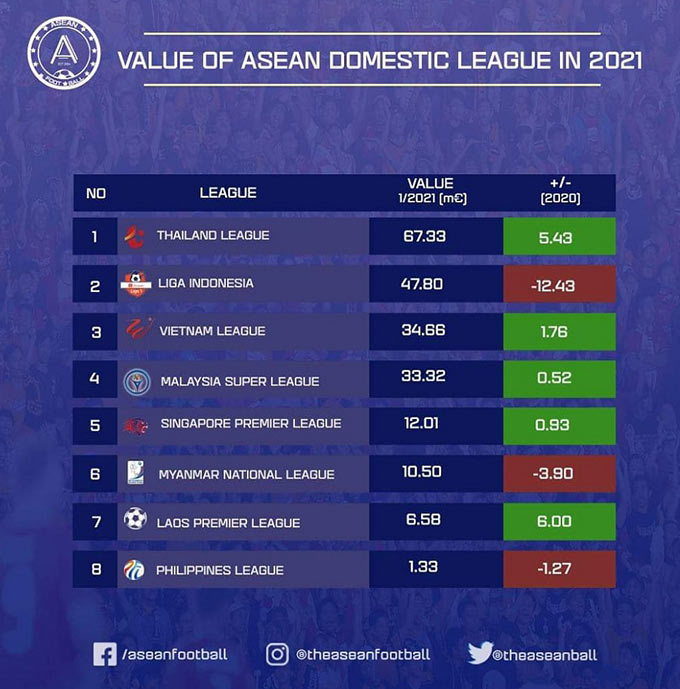 Giải VĐQG Thái Lan tăng 5,43 triệu euro và củng cố vị trí số 1 trên bảng xếp hạng với tổng giá trị 67,33 triệu euro. Giải VĐQG Indonesia chứng kiến mức giảm sâu nhất, mất tới 12,43 triệu euro. Tuy nhiên, với tổng giá trị 47,8 triệu euro, Liga Indonesia vẫn xếp trên V-League 1 bậc.