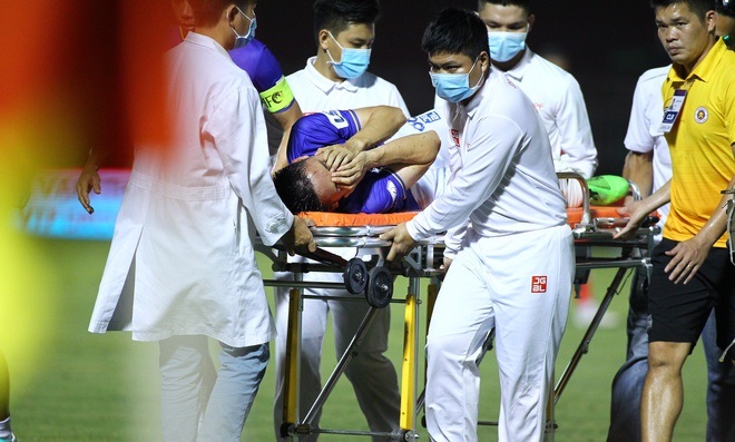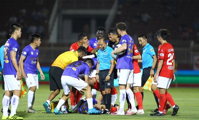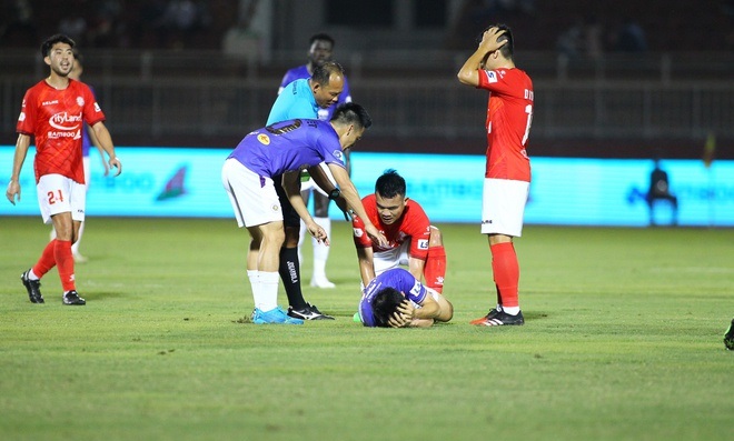 Tiền vệ Đỗ Hùng Dũng của Hà Nội FC dính chấn thương kinh hoàng sau pha vào bóng của Ngô Hoàng Thịnh bên phía TP.HCM.
