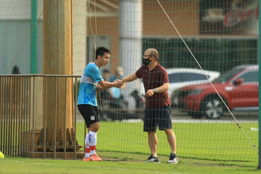 Các cầu thủ Hà Nội FC đang tích cực tập luyện để chuẩn bị cho trận đấu gặp chủ nhà Hải Phòng trong khuôn khổ đá bù vòng 3 V-League 2021. Trong buổi tập mới nhất, đoàn quân của HLV Chu Đình Nghiêm được đón những vị khách đặc biệt: HLV Park Hang Seo và các trợ lý của ĐT Việt Nam.
