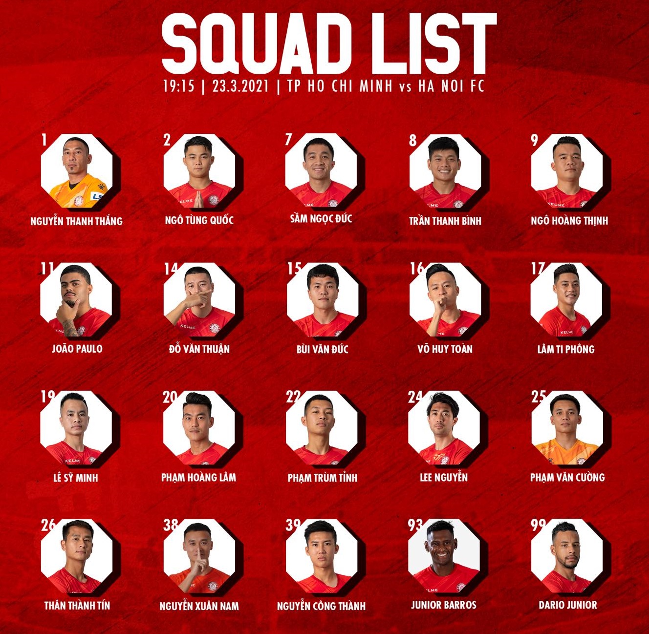 Sau buổi tập chiều nay, HLV Polking cũng công bố danh sách đăng ký 20 cầu thủ ở trận đấu với Hà Nội FC (19h15, 23/3). Đáng chú ý, thủ môn Bùi Tiến Dũng tiếp tục không có tên vì chấn thương.