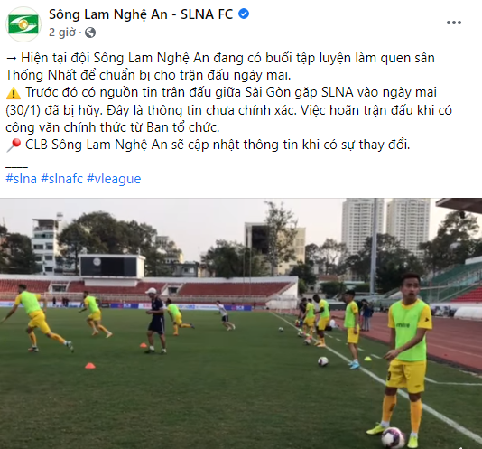 "Trước đó có nguồn tin trận đấu giữa Sài Gòn gặp SLNA vào ngày mai (30/1) đã bị hủy. Đây là thông tin chưa chính xác. Việc hoãn trận đấu khi có công văn chính thức từ Ban tổ chức", fanpage của SLNA viết.