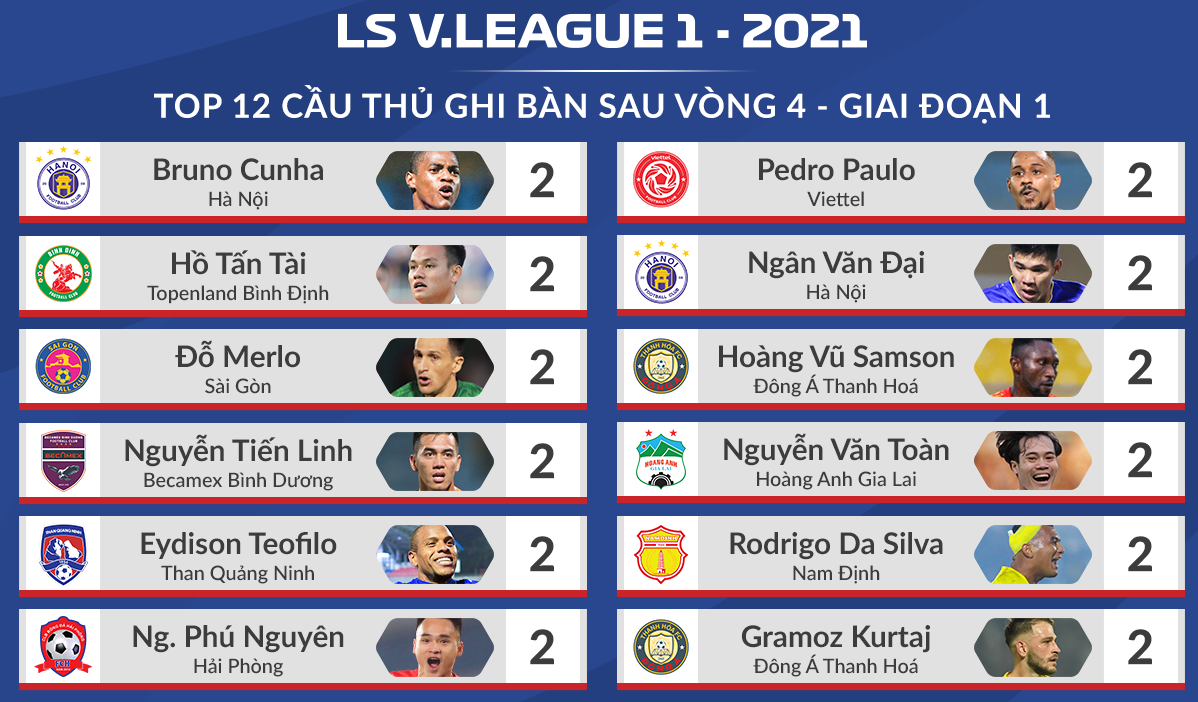 Viettel và HAGL cũng là hai đội bóng sở hữu những cầu thủ đang cạnh tranh danh hiệu Vua phá lưới: Pedro Paulo và Nguyễn Văn Toàn. Họ là 2 trong số 12 cầu thủ đã xé lưới đối phương 2 lần sau 4 vòng đấu tại V-League 2021.