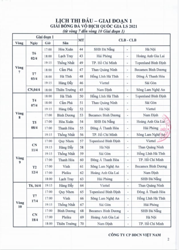 Lịch thi đấu V-League 2021 từ vòng 3 đến vòng 10