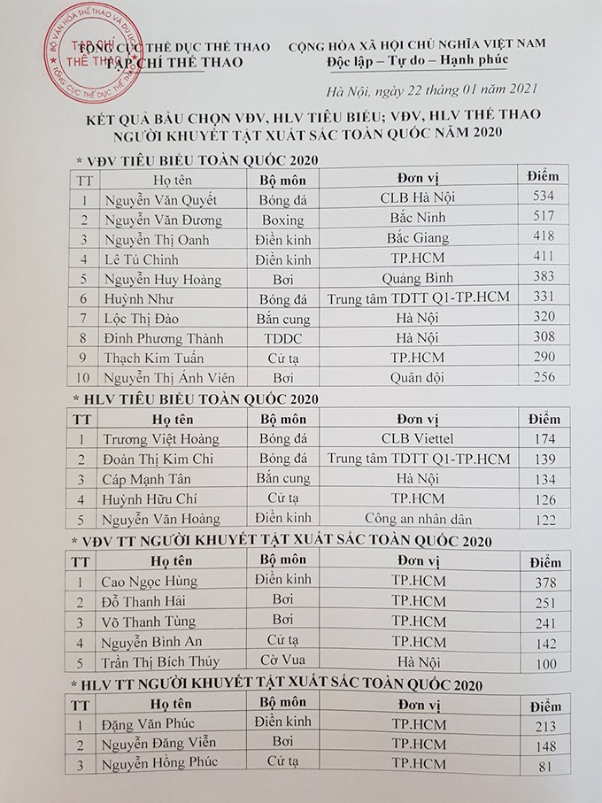 Kết quả bình chọn VĐV, HLV tiêu biểu toàn quốc 2020